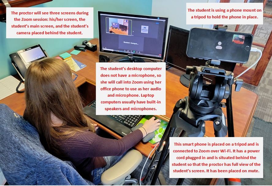 Students take the exam from home using a laptop or desktop with webcam and internet connection.